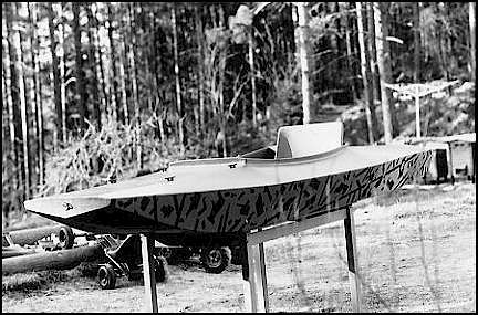 It was made in 10 days, 6 hour one day and 2-4 hours the rest. Painting not counted. No drawing was used.  A broken gardenchair saved a lot of work.  Works fine, easy propelled, light, takes waves well and all. There is not room for much gear like sleepingbag, tent and such. Maximum speed is maybe only ― of an ordinary kayak. But for sneaking or exploring where nobody else can go or turn itīs perfect. Build one yourself!