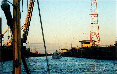 06 :00 hrs is my favourite wake up time while at home and more so on the boat. I wholly enjoy taking full advantage of long daylight hours. It makes me feel that I can accomplish anything! This is good for me, since my days accomplishments involve getting through two St. Lawrence Seaway locks. Going through locks is normally easy and I have never had any problems, per say. However, one troubling nasty little detail which should not be over looked is the booklet on Seaway Regulations. In particular, the paragraph which explicitly states that no vessel less then 6 metres (20 feet) in length shall transit the locks. With the Micro coming in at less then 16 feet, they are clearly referring to moi! Time to put on the thinking cap! Two strategies are envisioned; a) Hope that there are a few big sailboats waiting to lock through and then sucker up to one of the owners requesting that I be allowed to raft up to him as we both lock through. The bigger boat will help conceal the Micro and shade her from the busy eyes of the lockmaster. Or, b) Let loose with some really far out and desperate story about absolutely having to get through since my destination is downstream and I am are eagerly awaited as the boat is to be used as a funeral pyre for my recently departed and much loved wife/mother/father/hamster etc…