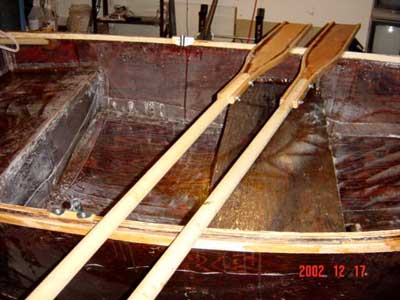 I wanted a small boat with an outboard motor to explore Lake Hopatcong in NJ. A unique feature about this boat is that the oars are made from wooden crutches! The oar handles can be attached from the blades. I used some dowels as handles and rope to make it fit into the oarlocks. I wasn’t sure of if I wanted to go with a sailing version or a rowing version – at the end I felt the rowing version would be fine. I bought a small 2.5HP motor from EBay that will get me around the lake. The boat looks dark because I stained the wood with Mahogany Minwax on the boat before I applied epoxy. This way I could leave the boat the way it is without painting it. I plan to varnish the boat this spring.
