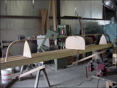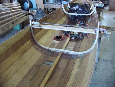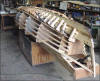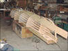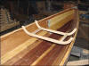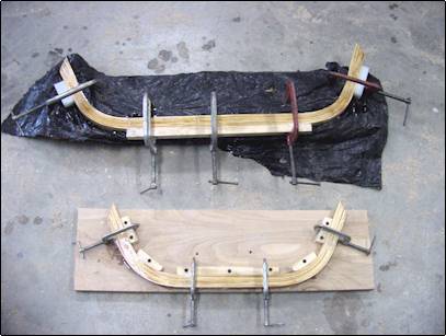 The plans call for the construction of four seat thwarts.  They are laminated from a dozen thin strips of wood glued into the proper shape.  I made some forms and glued the thwarts in place.  The one on top in the picture has the plastic that keeps it from sticking.  The lower one has the plastic removed so you can see the form.