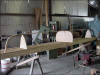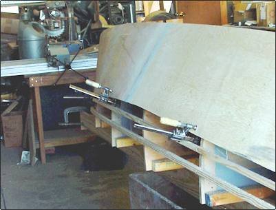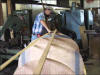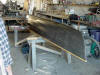The spliced together length of ply is presented to the form so that it can be marked (spiled - if you are a purist) prior to cutting the next strake.