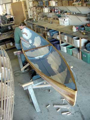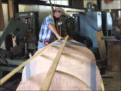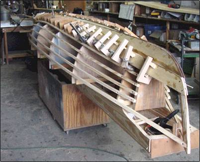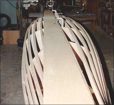 A center rib is made of four 1/8" thick strips laminated in place.  I used a black plastic trash bag to keep the epoxy off the hull.