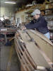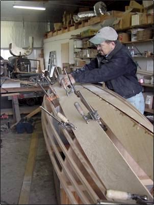 Here I am spiling (marking) the third strake.  You need lots of clamps for this kind of boat building.