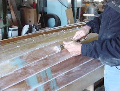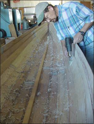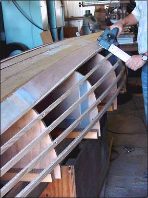 I also used the power planer to bevel the edges of the strakes that are already in place.  This face is glued just before the next one is placed and clamped.
