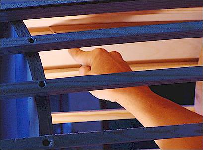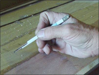 Here is how you move the pencil along the riband to make the mark on the ply.  Marks are made on the outside of adjacent ribands so that the strake is wide enough to overlap by the thickness of the riband.