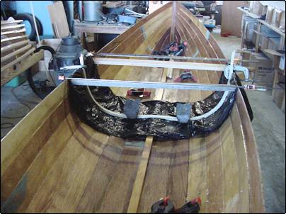 The next step was to glue the rib, the center thwart, and the inwales to the hull.  I used every clamp I could find.