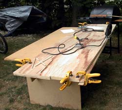 On July 7th we started construction by laying out the lines for the boats on the plywood.