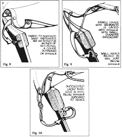 The outboard ends of decks, tents, and spray shields can be held in place with snaps or loops and hooks (Figs. 8-10). They can be attached to the outwale, under the outwale, or in the case of hooks even inside the boat if you drill a small hole under the gunwale to provide access for a small hook.