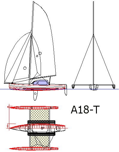 The boat can accept rigs up to and including those from a Hobie 16 at 218 sq. ft., complete with trap wires. The boat will also sail well with a 146 sq. ft. Hobie 14 rig. The masts for either of these rigs will mount to the forward aka tube. I designed the A18 for these two rigs as they are plentiful in the used market and are a forgiving, known rig for sail makers as well as thousands of sailors worldwide.