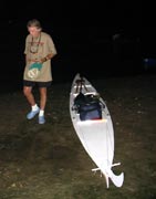 This is a relatively safe portion of the river but the kayak in front of me capsized when the current pulled him into a tree, about 500 yards from the start! Did you know that bananas float in the water? And, they were very tasty! This is not an event for the "recreational" paddlers that just intends to keep the boat moving. Chuck Lineweber and Skip Johnson, in Skip's 24' skin on frame kayak, started 10 min. after us singles and they passed me within about 30 min., going really fast. They were in about second or third place, at that point, I think. Fascinating boat! Magic! I was very pleased with my low, light and lean 16' kayak, Palindrome. The word kayak can be spelled backwards and it still spells the same! A palindrome. It was light (29 LB complete) and fast and the steering worked well. The only weakness in it's performance, was it's marginal crew. Hmmmmm, how about a "skin on frame" PDRacer! What is next? The Water Tribes Everglades Challenge? It's only 300 miles with no sleep! Should I try it single or tandem? Damn, this retirement stuff, is fun!