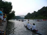 It was a dark and stormy night. I wish. It was a hot, humid day—not as hot as it could have been since there were some clouds and a bit of breeze. We sat under the trees with everyone else and waited. Spirits were good despite the heat and the slow march of time. Some of us splashed in the river. Three hours after leaving Smithville, the first boats began to appear. Mostly businesslike, they went through the resupply routine and departed. Some were slower to depart, spending time just lying in the water to reconstitute. “Coach” came into sight, and his crew met him out in the water. Maybe thirty minutes later, our guys arrived. I spotted them a ways off; Chuck’s paddle has white blades that flashed in the sun, and they were both wearing the slick white shirts that keep you cool by wicking the sweat away from your skin. They sat in the water to rest and rehydrate a bit while we refilled their jugs and heard about the checkpoint they had missed. There are 12 checkpoints along the way, some on land, some on the water, each with a different paper punch—a distinctive shape that goes in a certain square on the paper carried in each boat. A missed one means a time penalty at the end. If you miss one, you don’t go back, the current makes it too hard.