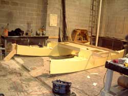 When we left off, Paul had basically finished the two hulls. I went up to Philadelphia for a long weekend and helped him make the bridgdeck. We upped the 4’ x 8’ ply deck from 1/4” to 3/8” because of my weight and for the Everglades Challenge 2005.