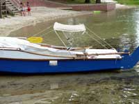 But the boom on our 20-foot boat (also a balanced lugger) is high enough to allow a bimini, and the mainsheet is far enough aft to make it feasible. When Chuck Leinweber at Duckworks provided the mounting and other necessary hardware and a small bit of technical advice, the scales tipped.
