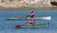 Heather has a whitehall (a Jim Thayer hull) and I row a skiff of my own design. Wil is the quiet one of the two, but is a watcher of the first order. He doesn't care for instruction but bides his time until he's ready, then lets you know he wants to try. Well, you would have thought he was a seasoned rower; he has to walk the rolling seat back and forth, the oar overlap came naturally, and he could turn and back.