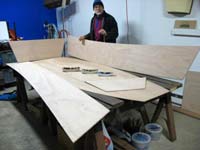 I decided to use sheets of 5x10 plywood again, as I am in a hurry to get as many prototype hulls of my newest designs built as possible. My local supplier, EdenSaw Woods still had a good price on 5x10 sheets just a few dollars more than the 4x10's, and I can always use an extra ten square feet of cheap okume 1088. I've added a couple of photos of my work platform to show you what's turned out to be a good solution to the home builder. The platform can be taken apart and stored between projects; or sold to your friends and neighbors when they see you out in your new boat and are struck by one of the seven sins.