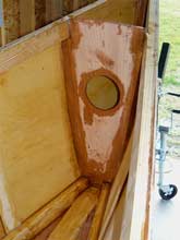The last bulkhead to be put in was in the stern, forming the front support for the slop shelf and the front wall of the aft floatation chamber. But first the shelf itself was constructed. Drain holes were drilled in the transom and the edge grain sealed with epoxy. Shelf supports were glued and screwed to the side planking.