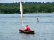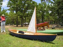 A variety of small boats and their handlers attended the 2008 messabout. Local boatbuilder and designer David Nichols and his son came with one of his Indian Girl canoes, complete with downwind sail. Unfortunately there was no wind, but it is still a fine craft! |