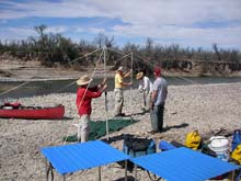 | It has been another hot day so when we stop around mid afternoon, Skip and I rig a sun shelter from a tarp and a couple of paddles. We thougth we were pretty clever... |