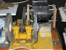 Here is the typical yard sale grinder, made from a very old appliance motor. To work right, you need 1750 rpm – more is just asking for trouble. I think you also need it turning toward you. Turning away from you it tries to lift the blade and spoil the bevel. However it may just be that my wheel is a little uneven.