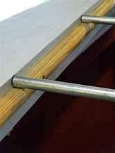 The next effort borrowed from the design of a tonneau cover I’d had on the back of my pickup, featuring L-shaped rails on the sides of the bed which supported tubular metal bows, which were in turn attached to the vinyl covering with velcro strips. This design had worked great on the pickup. The only problem with using it on the boat was that I’d have to learn to use a sewing machine. I did learn, and managed to do a serviceable job, I think. The old, all-metal Singer machine had no trouble handling the Sunbrella-Plus fabric (a remnant bought on--you guessed it--eBay), and our local variety store supplied industrial-strength Velcro. I relied on the adhesive backing to hold the Velcro onto the bows, but sewed it to the cover because only the middle had to be fastened--the rest wraps around the bows. Little squares of Sunbrella were cut to place over the exposed Velcro adhesive to keep it from being the best, most expensive, flypaper in the world.
