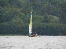 The WindRider provides a wide and stable platform when sailing downwind. On my boat the amas are 12 feet apart. With its relatively deep and long keel well-aft in the boat the steering is sure and stable, even when surfing down the waves. I started out using the full main and the reacher set on the bowsprit. Soon I furled the big head sail, and deployed the jib. Finally I was down to full main alone. As the wind built, the waves, with almost 100 miles of fetch, built as well. I would sail up on a wave, with the crests at times more than 3 feet above the bow, and, as the bow lifted on the wave, push through. A few times the water broke around the windshield. The boat surfed down the face of the wave, once hitting 12.5 knots. I wasn’t exactly white knuckling it – I was exhilarated – but I found myself wishing I had a reef in the main, so that I would feel more confident about sailing closer to the wind if needed, or slowing down to wait for the other guys to catch up. With a full main I felt like all I could do was keep on keeping on and hope that nothing required me to go forward (like a snagged line) or to change course.