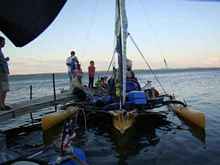 Rick’s boat was a different kettle of fish. He was inspired by the Corsair F-27. He has custom aluminum and net seating on the sides of both the cockpits. He steers by hand with a tiller, his feet securely planted in the rear cockpit. He has replaced his flimsy plastic floor with an attractive wooden floor with easy access to bilge storage. I have to haul myself out of the rear cockpit to move about the boat, he is already “on deck” and can quickly move about the boat as needed. His most radical change was to cut off his deep keel and replace it with a centerboard and add a transom-mounted rudder. The main advantage is to reduce his draft significantly and make the boat point higher. On this trip his boat was riding a low in the water with David aboard and extra camping gear.