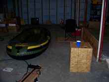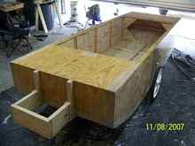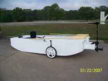 At this time, the battery was just sitting on the floor.  I am also launching at “Galena Marina” which has no other boats being launched, so it's like my own personal boat ramp.  It's so shallow here (about 5 inches) that nobody can launch (except for me, yeah!).  After I installed the battery permanently, and added an electrical system, the boat was too heavy for me to load into my pickup, so I had to build a trailer.  The Harbor Freight trailer was the right size and cost for this project.