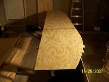 This is my method of bending the skins using big turnbuckles and 2 X 4s. The two bottom sheets join at the center of the bottom.  It was still difficult to bend the wood this much, about at it's limit.  I had to drive at least a dozen #10 screws 2 ½ long on the plywood end to get it to hold position.