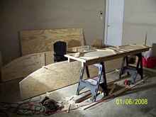 The chine logs and stiffeners were 1 X 2 pine.  Notice that I cheated and cut the curves in 1 X 4's with my jigsaw instead of doing any board-bending.