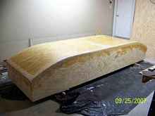 After righting, the fore and aft decks were fabricated and attached.  It looks like a real boat at last, and kinda nice in natural wood finish.  Maybe I won't paint it for a while.