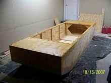 I built frames for the bow and stern panels, and glued and screwed them in place.  I built a framework for the floor using 2 X 2 fir, and a 1 X 2 over a 1 X 4 for the center rib where the two bottom plywood sheets would attach together.