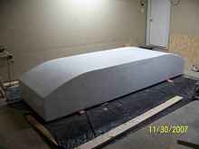 Turned upright, I painted the inside and decks the same way, and reinstalled the landing gear.  I mounted blocks on the nose to catch under the front lip of my pickup truck bed to hold it in place.