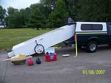 Note the fiberglass case that hold the Evinrude 3.  Believe me, the boat barely fit, and the fact that I could self launch this #250 boat says how dedicated, strong and stupid I was.  I was diagnosed with “anti-traileritis a few months later.  Also note the yellow belt around my pickup bed that I used as a boat retainer. Yes, it can be done.