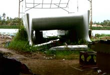 In Nha Trang I stumbled across a fiberglass shop and piled outside - fiberglass coracles! Our driver got me inside, a Robb White nostalgia moment, not the sweet smell of 1/2 pint to the gallon old outboard exhaust, but the strong stink of polyester resin. These guys were busy. Coracles, bath tubs, inboards, outboards, wave piercing cats and tri's, it was like South Florida 40 years ago. We can make anything! I saw the mold for the coracles and found a finished product out back. Note the wide molded gunwale with molded in pad eyes. Somehow gunwale just don't seem right here does it.