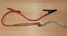 A standard alligator clip for jumper cables was used to attach the shorter unit to the shrouds.