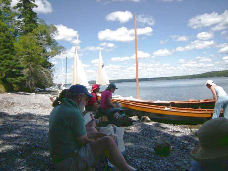 Thursday began with getting all 49 of the boats launched, which was accomplished in a little over an hour! We then set sail for Thomas Island, about 5 miles away. The wind started out at about 5 knots, but continued to build throughout the day to 10-15. We all experienced a lot of spray and occasional water over the rail. As crew, I tried to shield the skipper from the spray, ending up quite soaked, but smiling as we clipped along under a full blue sky. We took a break on Thomas Island for lunch and then headed back to Lamoine with most boats choosing to reef.