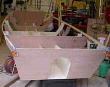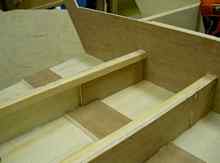 I glued the girders, frames, and bottom sheet with polyurethane glue, which hardens quicker than epoxy and can be used in cold temperatures. It forms froth, which has to be removed while it is still soft, but it speeded-up my construction by several days. Cleats were added along the joints to increase the gluing area.