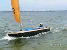 A rear cabin also gives some advantages when sleeping in the evening especially if the 5 foot or so in front of the cabin is open. You can simply slip your body forward and down to sleep with your feet tucked under the front deck and your trunk and head in the higher headroom rear cabin area. Probably the best-known historical boats to use this method were the Barnegat Bay Sneakbox which were designed for multiday hunting trips. In fact, I was inspired by this design enough to make a similar boat using Gavin's flying rat as a platform. I called this 12' boat Queequeg's Coffin after the coffin used as a lifeboat in the literary masterpiece Moby Dick. Besides, the boat sort of did resemble a coffin when I was through with it. I used this boat for the 2010 Florida 120 but found the leeboard to be undersized for coastal sailing especially when confronted with tall chop in light winds. The chop would slow the boat to the point that the leeboard didn't have any bite and the boat would slip to leeward making no progress towards the goal. Still, the sleeping accommodates, while spartan, were comfortable and easy to set up. I also tried and loved a tiller rope setup where lines came off the rudder yolk and went around the inside of the cockpit through a series of pulleys. Not only did this steering setup avoid the embarrassing "dropping of the push pull tiller pole" but it also made the helm somewhat self