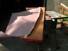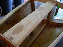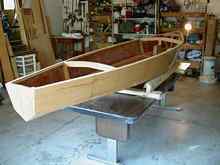 I scrubbed the epoxy with water and abrasive pad to remove the chemical that magically makes urethane sit for eternity without curing, and was delighted by the look of the birch with mahogany trim. Top and Inside and Test Paddle As it was time to work on the top and inside, I made a stand, which after puzzling came out a very simple design. Four 2x4s (that framing mentality again) set one way supported the boat upside down, and the other way right side up. Carpet strips tacked on protected the now important finished surfaces.
