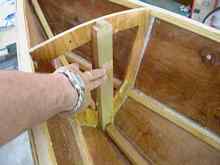 After filling the gaps and screw holes, and a ton of sanding, I was ready to do the glassing. I was worried about this. I'd used strips of fiberglass cloth in epoxy on the joints on my other boat, but couldn't afford the epoxy required to do the whole hull back then. So I put it off a while by setting the hull upright and learning how to make epoxy putty (with some stiffener and sawdust) and get it into the interior of the hull, all around the stringers and keelson and daggerboard, and the joints between the ribs and plywood. This was a nasty job and seemed to consume a ton of precious epoxy. I mixed it usually two squirts of epoxy at a time, put it into a baggy with a tiny bit of corner snipped off, squeezing it out with the best approximation of a caulking gun I could achieve, and spreading it with a piece of epoxy "squeegee".