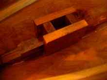 Around this same time, another perplexing set of details needed resolved, which is how to brace under the decks, and especially make the mast step. I'd ordered the sail but it was not due to arrive for over a month (as it turned out, Bill Tosh finished weeks earlier than he had promised), and I didn't want to try to make the spars without actually having the sail. But I wanted to finish the top, and that meant making the mast step. I finally settled on a single 1x1" piece of mahogany down the centerline to brace the stern deck, and a complex of bracing shown in the figures below to handle the forces of the mast.
