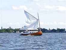 This boat is a Fenwich Williams 18 Catboat designed back in the 30's when boats were built with massive lumber and people were short. They must have been because if the boat is built according to the plans there's not even sitting room in the cabin for anyone over ten years old. I built the hull using cypress strip planking then heavily glassed. Howard finished the rest of the boat but added six inches to the cabin height so it's actually usable. This boat is a lot lighter than the original and we didn't want to add a lot of ballast we would have to haul around so it has a 100 gallon water ballast tank built in up front to bring her down to her lines. It's filled and emptied with a high volume transfer pump. The plans offered two different size sails but we didn't like either, too small for the light winds we usually have here in Florida so we added a bunch more sail area. The two sets of reef points will be handy when the wind picks up.