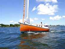 Howard's decided that it's time to sell another one of the treasures he's made here at the shop so we took Sweet Pea out for a spin to get some beauty shots. This was actually a first for several things. This big Catboat has been finished for a while but we've never had her out when there was any wind to speak of to see what she'll do with this big sail. Howard didn't like the eight horse power Yanmar diesel that he had put in so he's changed that one out lately for a two cylinder sixteen h/p version and what a difference it made. This was also the first time the mast was raised and lowered with an electric powered winch.