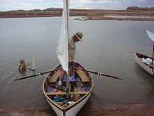 While we looked for a good spot to set up camp, Jim Thayer (whose Lake Powell Kokopelli annual messabout would be at the full moon later in October) drove in with his sailboat, Nina. Soon his friend Jack Hicks would appear at the mouth of the bay, rowing his A Duckah. Right behind Jack was his daughter, Heather Gale, rowing her Whitehall. What fine graceful boats! The smooth rhythmic process of rowing only adds to the beauty. With Heather were her husband Tom and children Wil and Ruby from Cache Valley, Utah. Wil and Ruby spent a good deal of time in the water and the mud! When Bruce came back in his sailing pirogue he was accompanied by Randy Swedlund and Dustin Robb, all three from Prescott.