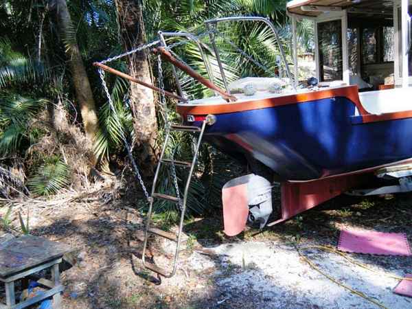 Here's the rudder that I made for the outboard. I couldn't turn with just the motor so I molded one to the motor so it fits like a glove. Fiber glass and carbon fiber make a really strong rudder. Also is a picture of the boarding ladder. We've all had the experience of trying to get back on the boat and having to fight for our lives; the ladder goes under the boat, you have to do one leg knee bends or you need a crane to haul you out. After months of thought this is what I came up with and it works perfectly. This is even easier than using the step ladder.