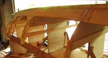 The bottom is 18 mm plywood and the planks are 6 mm plywood. The standard choice for planks is 9 mm, but I decided on the lighter planks, which I later reinforced with a second laminated layer where necessary. For bulkhead framing I used pine.